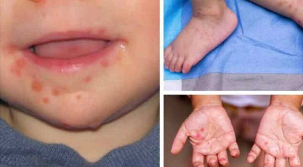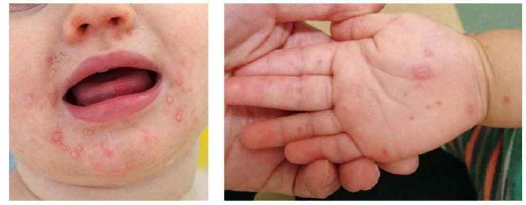 Coxsackieviruses commonly causes painful blisters in the throat and on the tongue, gums, hard palate,inside of the cheeks, and the palms of hands and soles of the feet (aka “Hands Foot Mouth Disease”). Less common symptoms include: blisters on the buttocks, herpangina (causes red-ringed blisters and ulcers on the tonsils and soft palate, the fleshy back portion of the roof of the mouth), hemorrhagic conjunctivitis (affects the whites of the eyes, usually begins as eye pain, followed quickly by red, watery eyes with