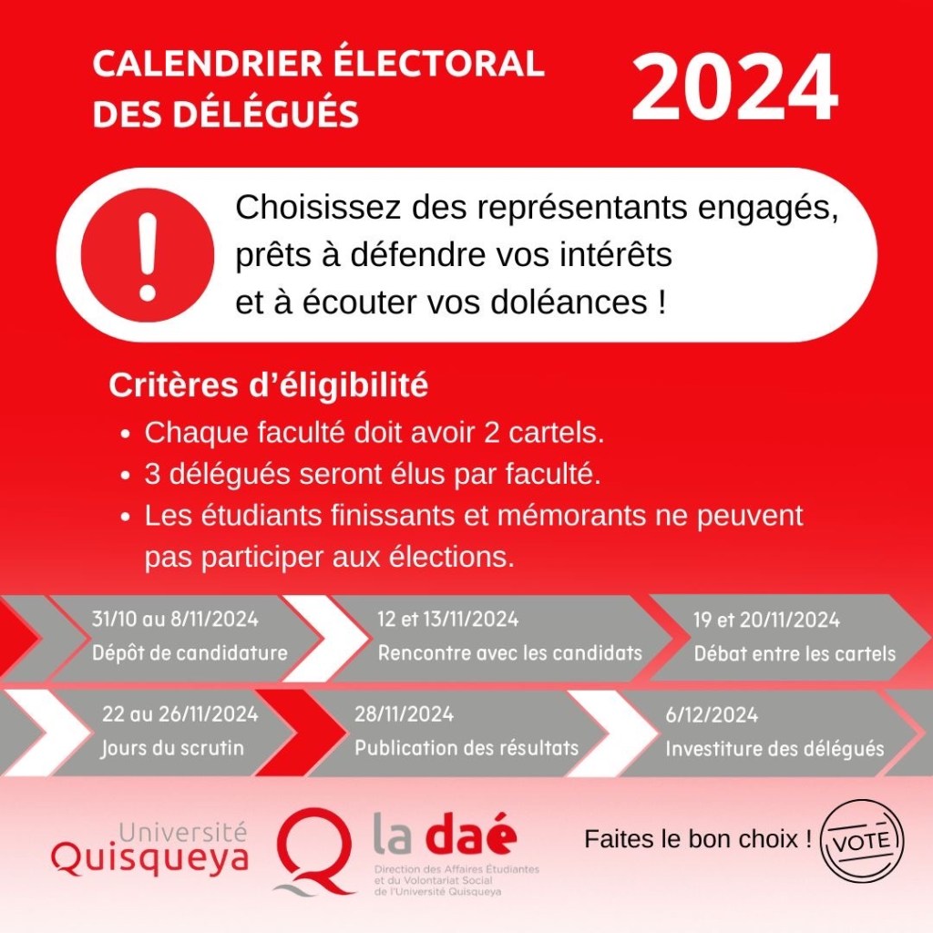 Le calendrier électoral est désormais disponible, et chaque étudiant est encouragé à participer activement à cet exercice démocratique. Plus qu’un simple vote, il s’agit d’une opportunité pour chacun de contribuer à l’avenir de l’Université Quisqueya.