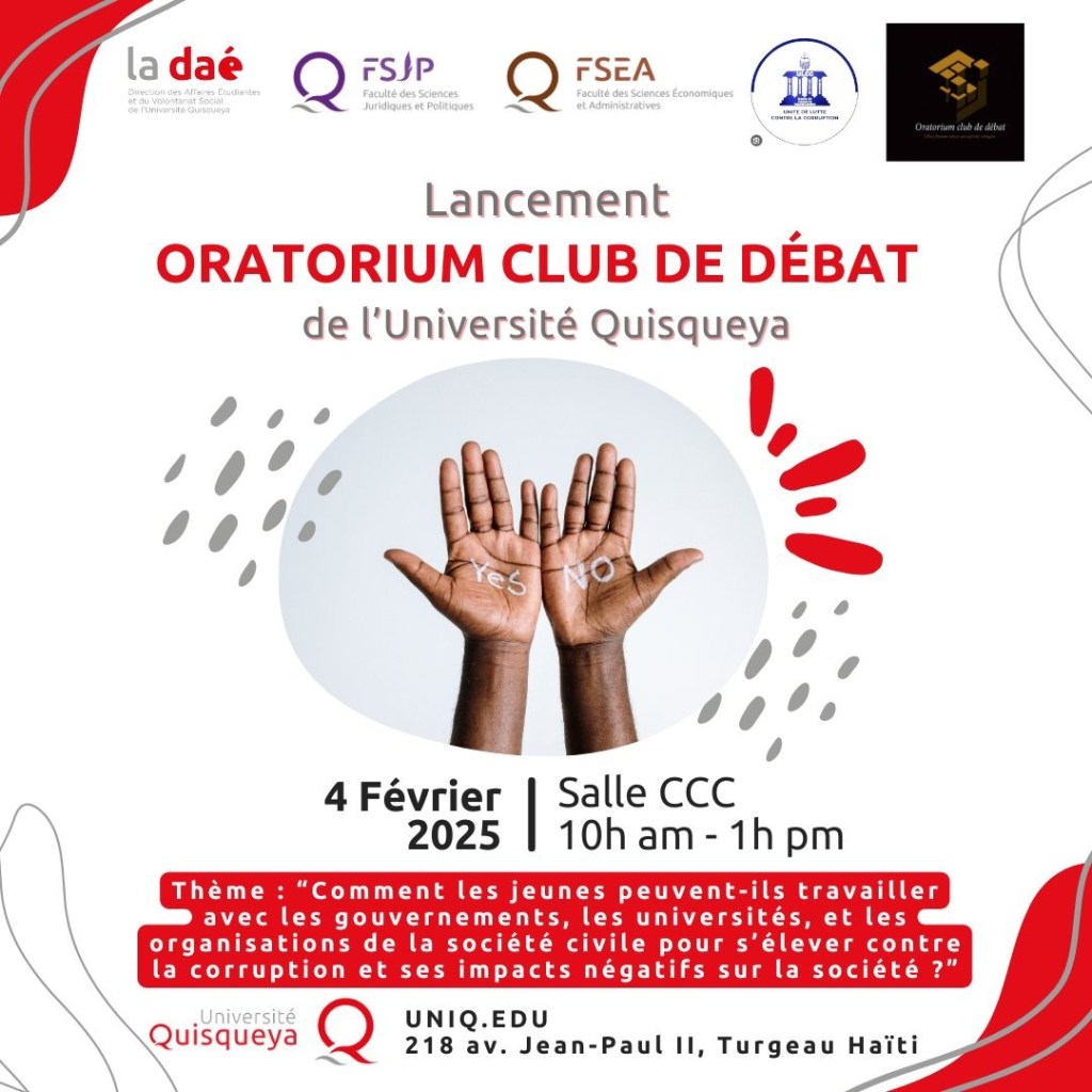 La Direction des Affaires Étudiantes (DAÉ) de l’Université Quisqueya (UniQ) à l’honneur de vous inviter au lancement officiel de l’Oratorium Club de Débat.