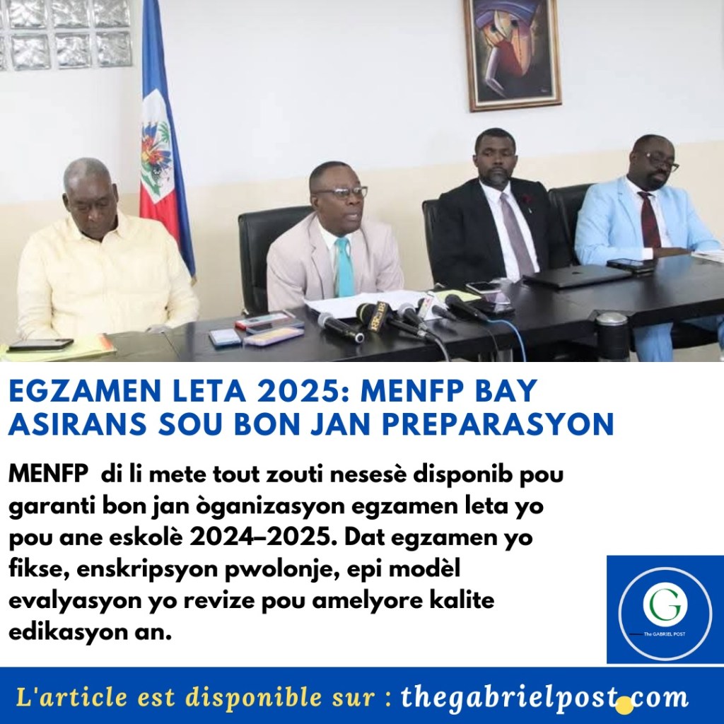 Ministè Edikasyon Nasyonal ak Fòmasyon Pwofesyonèl (MENFP) konfime tout dispozisyon yo deja pran pou bon jan òganizasyon egzamen ofisyèl yo pou ane eskolè 2024-2025 lan. Daprè otorite ministè a, kalandriye eskolè a rete san chanjman, e egzamen yo ap kòmanse lendi 30 jen 2025 avèk elèv 9vyèm ane fondamantal yo pou fini vandredi 18 jiyè 2025 avèk kandida Fòmasyon Teknik ak Pwofesyonèl yo.
