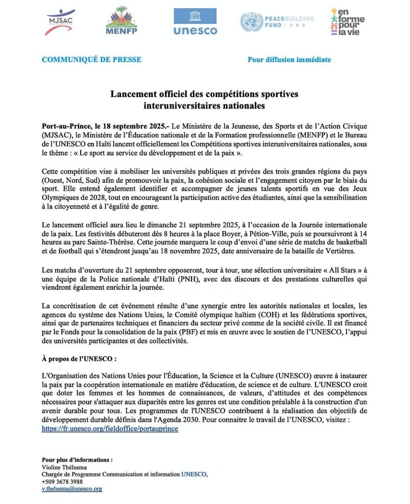 .- Le Ministère de la Jeunesse, des Sports et de l’Action Civique ( MJSAC), le Ministère de l’Éducation nationale et de la Formation professionnelle (MENFP) et le Bureau de l’UNESCO en Haïti lancent officiellement les Compétitions sportives interuniversitaires nationales, sous le thème : « Le sport au service du développement et de la paix ».