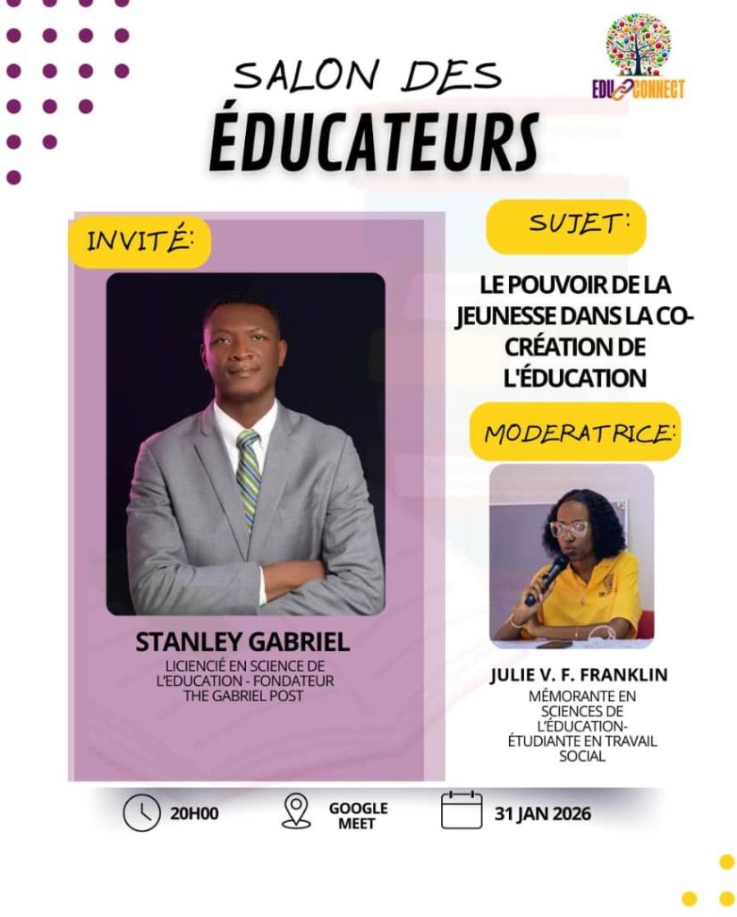 Centré autour du thème : « Le pouvoir de la jeunesse dans la co-création de l’éducation » , il sera animé par notre invité d’honneur Stanley GABRIEL.